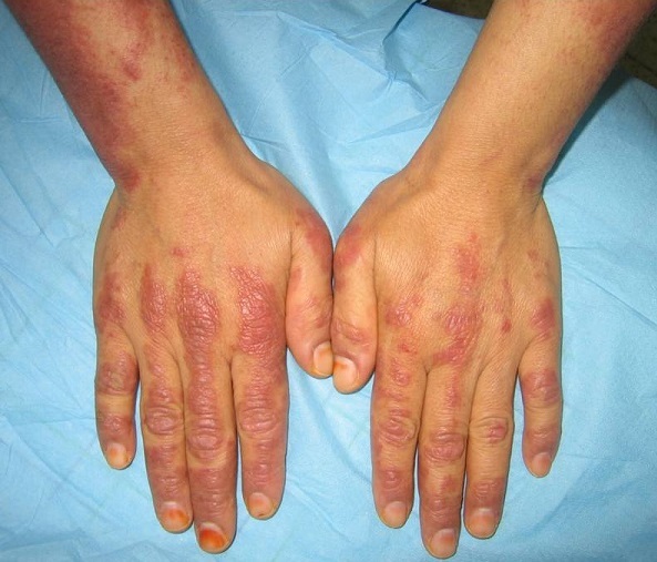 The most common symptom of dermatomyositis is a rash that develops on the face, neck, chest, or upper back. This rash may be red, purple, or blue in color and often has a “strawberry” appearance. The rash may also be accompanied by itching, burning, or peeling skin.